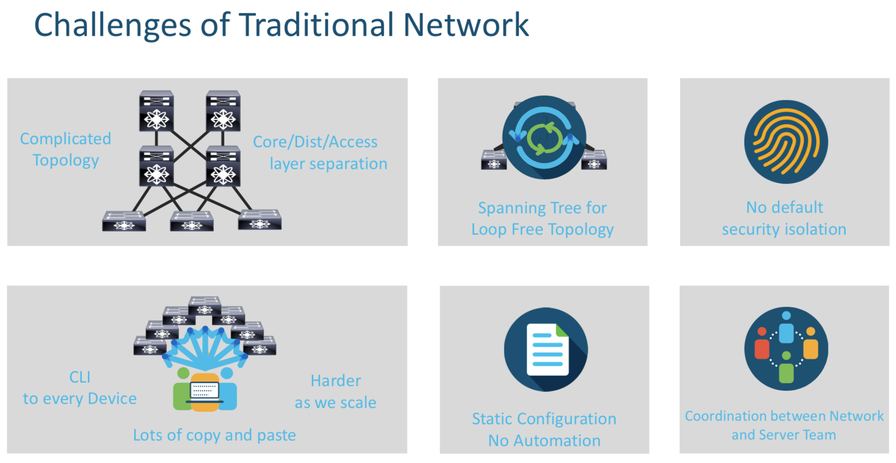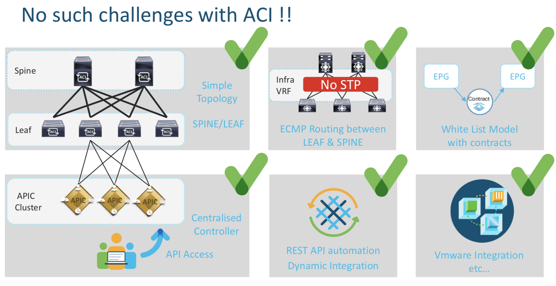 ACI solves the above challenges by providing a simple Leaf/Spine Topology, ECMP which removes the dependency on STP and so on an so forth .
