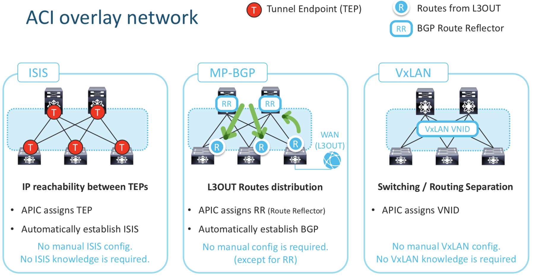 ISIS : This enables IP reachability between TEPs , the APIC assigns the TEP address. ISIS is automatically established and requires no configuration.