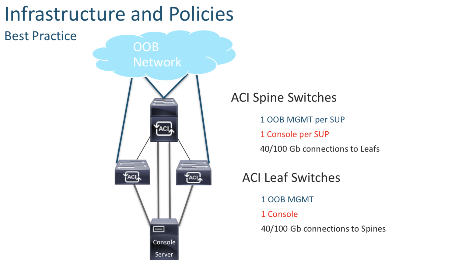 You can access the the Leafs and the Spines using their Console ports on via the APIC (which in turn connects via VTEP addreses). BUT it is advisable to have individual Management IP Addreses assigned to these devices directly (config done after discovery) , so that inc ase we need to access them.