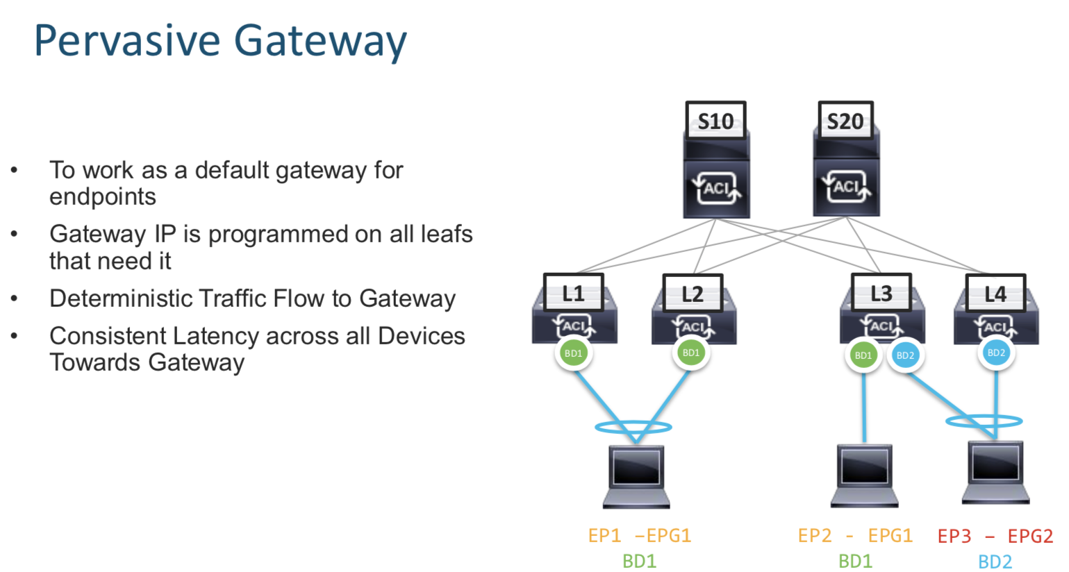 Pervasive gateway means a local gateway residing on every switch for each subnet on that switch.