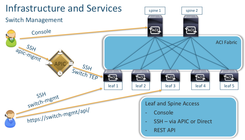 All the internal communication betweek the Spines,Leafs and the APIC happens on the Infra IP Address denoted by red T in the picture above. The reachability provided by this Infra Network is then used to deploy the required L2/L2 config wherever needed on the leafs.