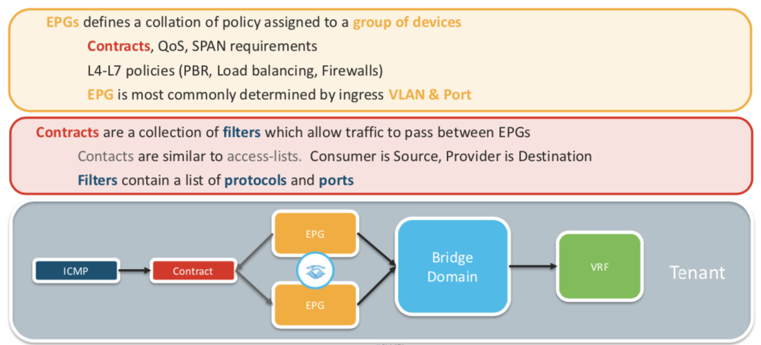 Tenant Policies: Its is more about configuration related to EPG/BD/VRF. A tenant is a logical container or a folder for application policies. This container can represent an actual tenant, an organization, or a domain or can just be used for the convenience of organizing information.