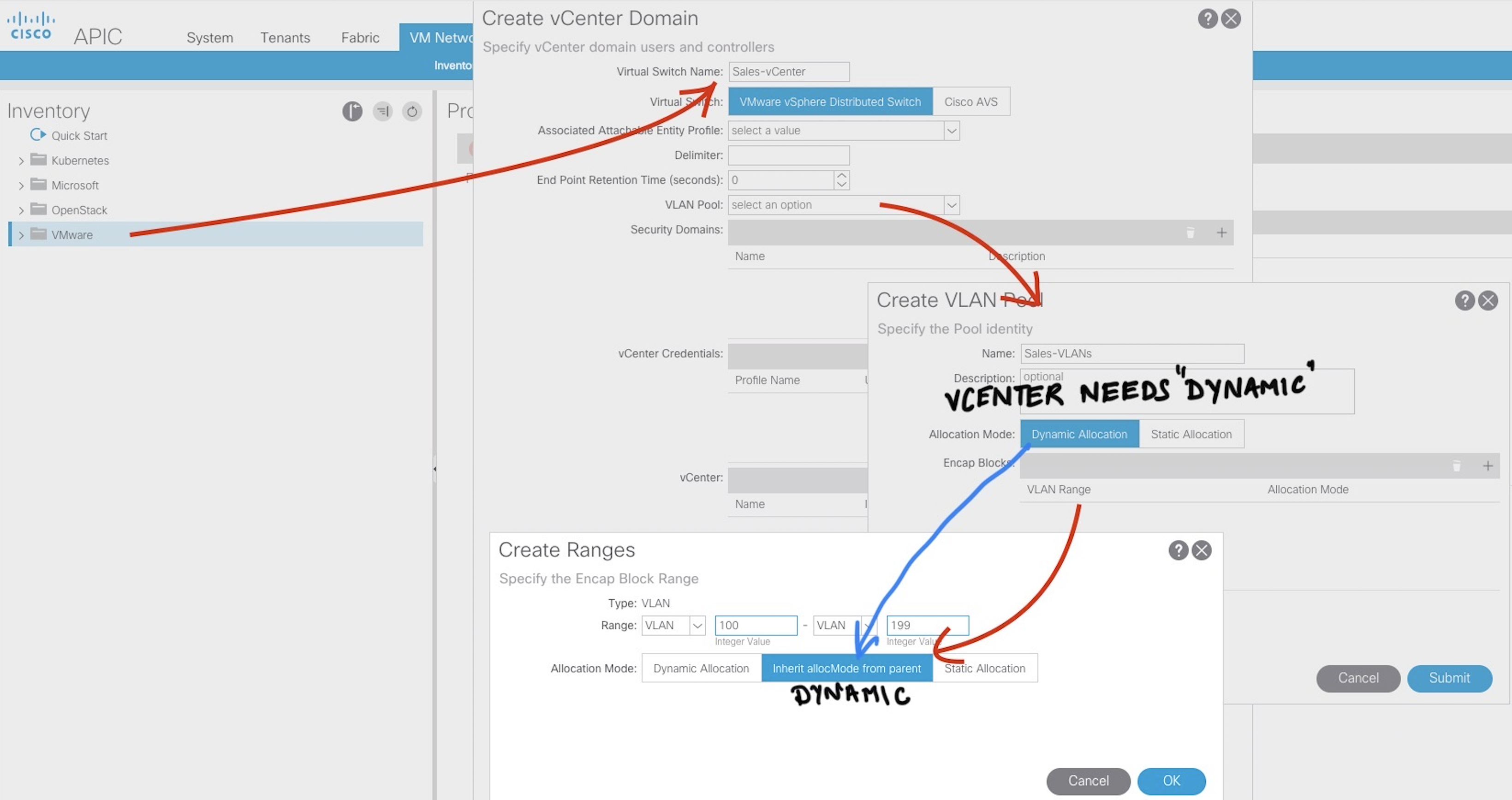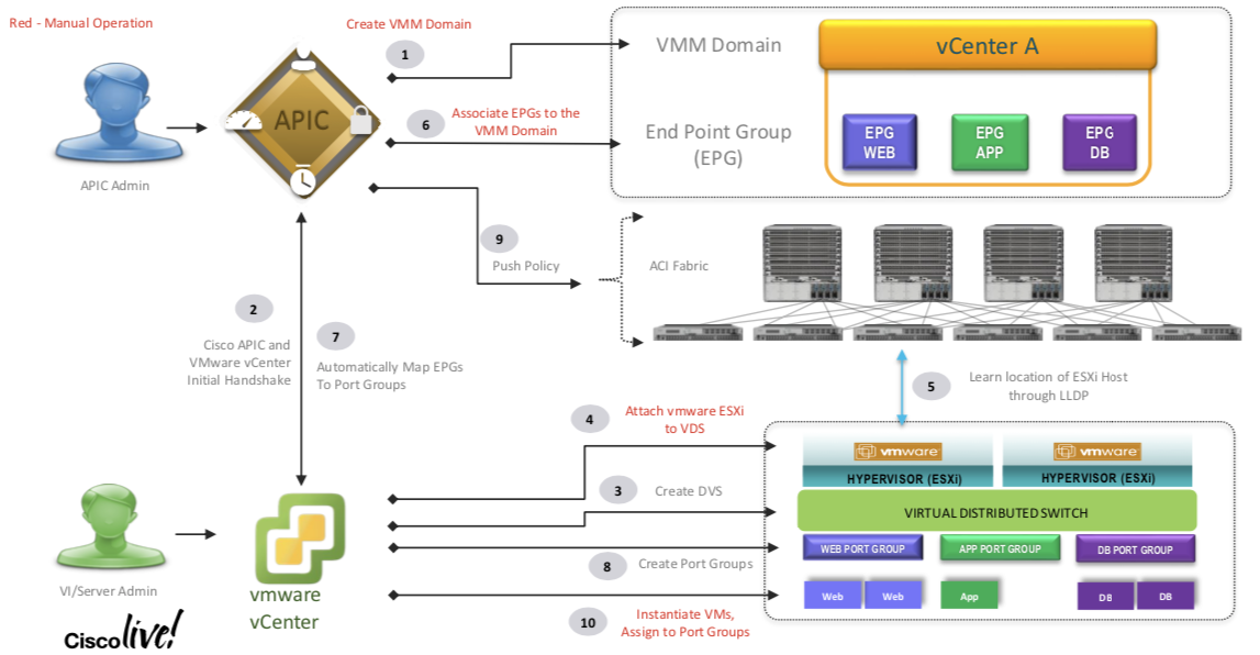 - Step 2. ACI and VMWare handshake (the communication between APIC and VMWare happens on the Out of Band Network NOT on the INFRA network; We can use the Inband network but is NOT recommened.)