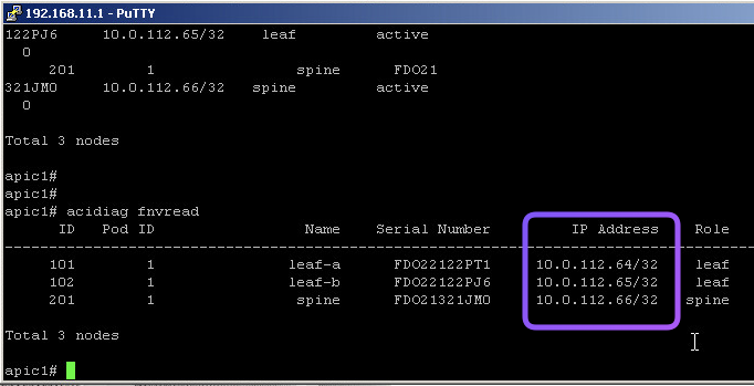 The Cisco ACI solution uses an overlay, based on VXLAN, to virtualize the physical infrastructure. This overlay, like most overlays, requires the data path at the edge of the network to map from the tenant end-point address in the packet, also known as its identifier, to the location of the endpoint, also known as its locator. This mapping occurs in a function called a tunnel endpoint (TEP), also known as VXLAN tunnel end point (VTEP). The VTEP addresses are displayed in the INFRASTRUCTURE IP column. The TEP address pool 10.0.0.0/16 has been configured on the Cisco APIC using the initial setup dialog. The APIC assigns the TEP addresses to the fabric switches via DHCP, so the infrastructure IP addresses in your fabric will be different from the figure.
