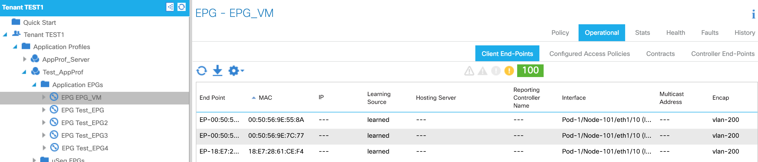 Notice that there is no explicit mapping between the Switch Profile / Interface Profile configs and the Tenant Config (EPG) ; so do not confuse
