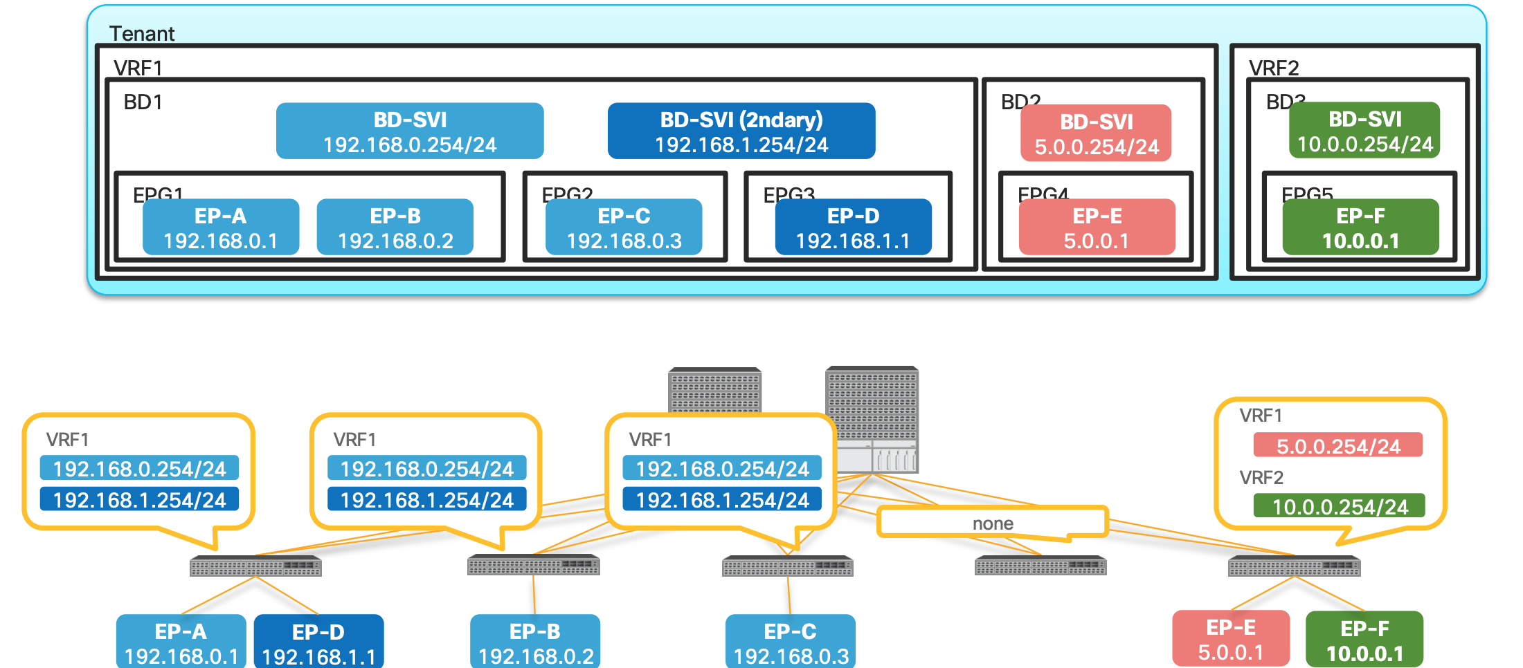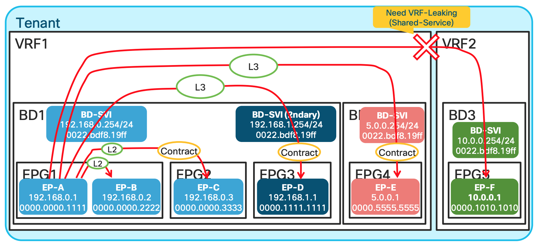 EP-A talking to EP-B: In this scenario , since both EPGs are in the same subnet and same L2 domain the traffic is Layer 2 Switched.EP-A talking to EP-C: Same Bridge domain but differen EPG , and has a contract , still L2 switched.EP-A talking to EP-D: Same BD , but different subnet ; hence L3 routed.EP-A talking to EP-E: Different BD and different network hence L3 switched.EP-A talking to EP-F: Differen VRF , unless route leaking is implemented no traffic communication happens.