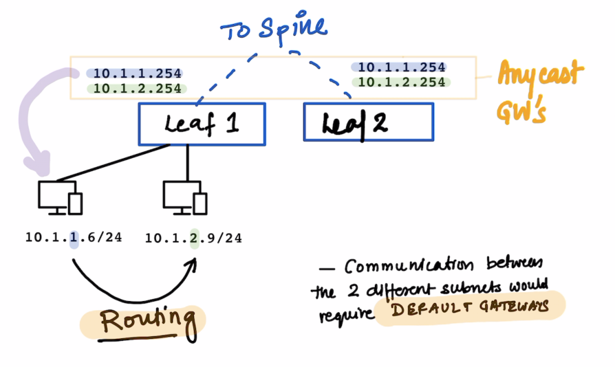 The default gateways for the same are configured on the leafs.