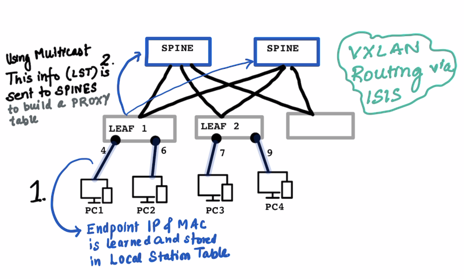 SPINE’s proxy table , which responds back witht he VTEP address of the Leaf which has the IP Address10.2.2.1 Leaf1Stores this received information about10.2.2.1into itsGlobal Station Table- Communicatin starts on a VXLAN encapuslated packet as usual.