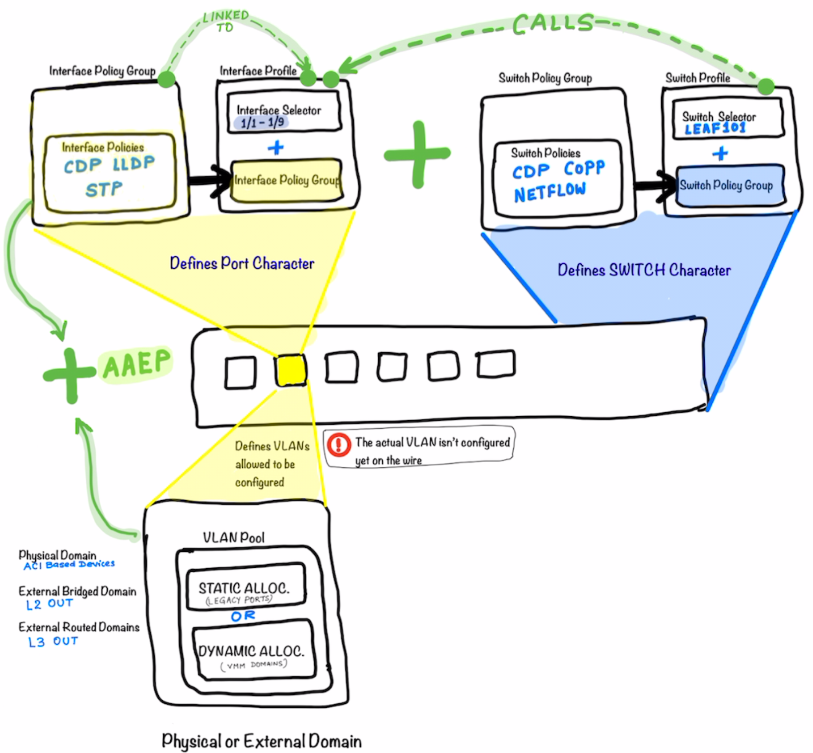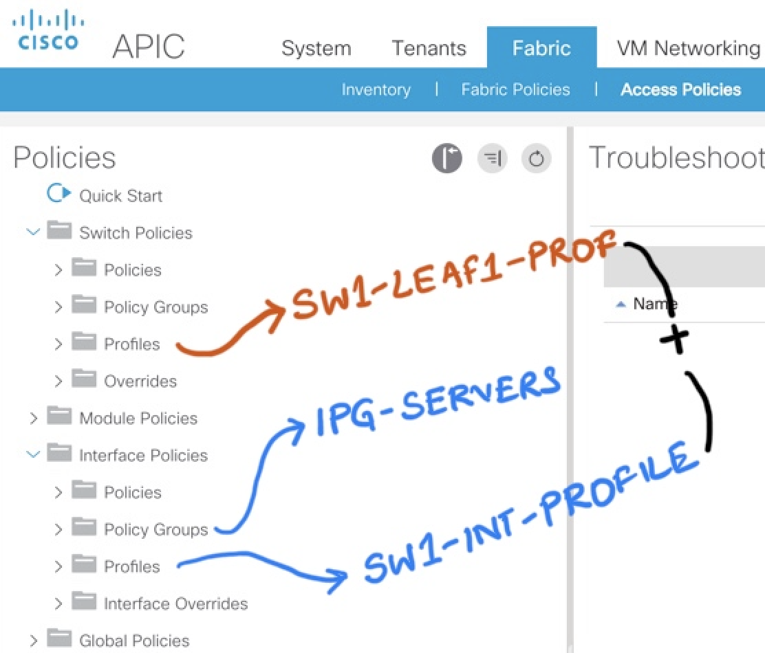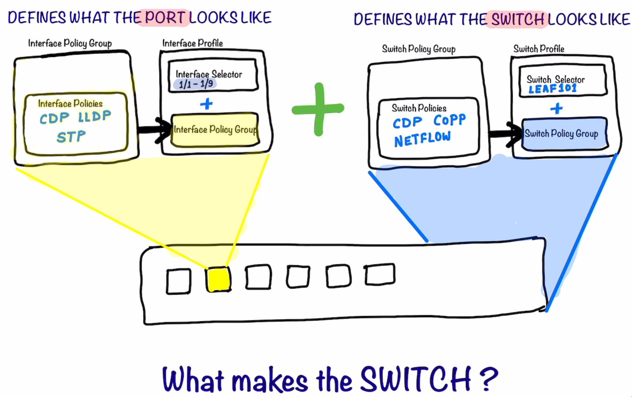 The Switch Policy Group is tied to the Switch Profile which in turn is called-in in the Interface Profile .