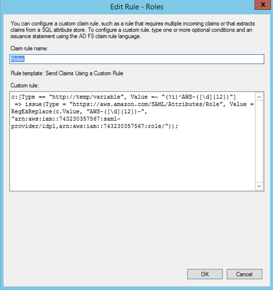 => issue(Type = "https://aws.amazon.com/SAML/Attributes/Role", Value = RegExReplace(c.Value, "AWS-([\d]{12})-", "arn:aws:iam::743230357567:saml-provider/idp1,arn:aws:iam::743230357567:role/"));