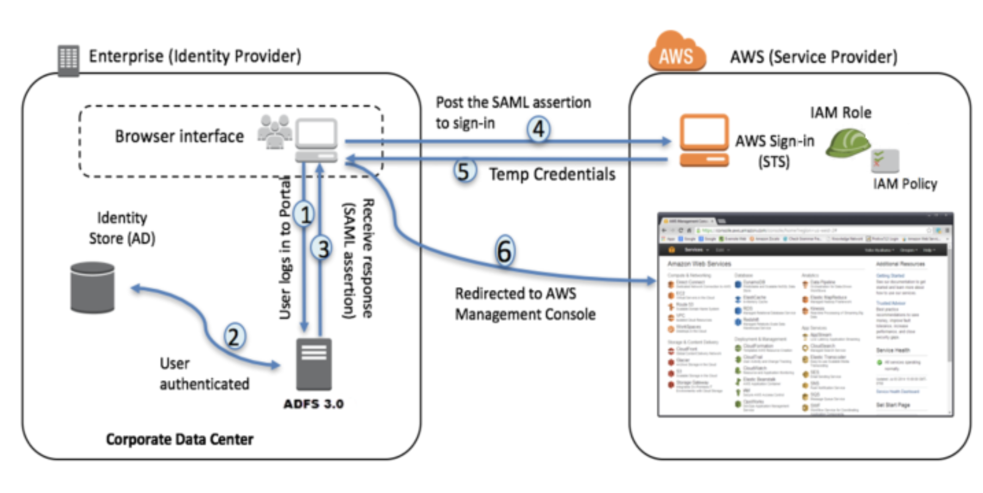 AssumeRoleWithSAML. - The user is authenticated and provided access to the AWS management console.