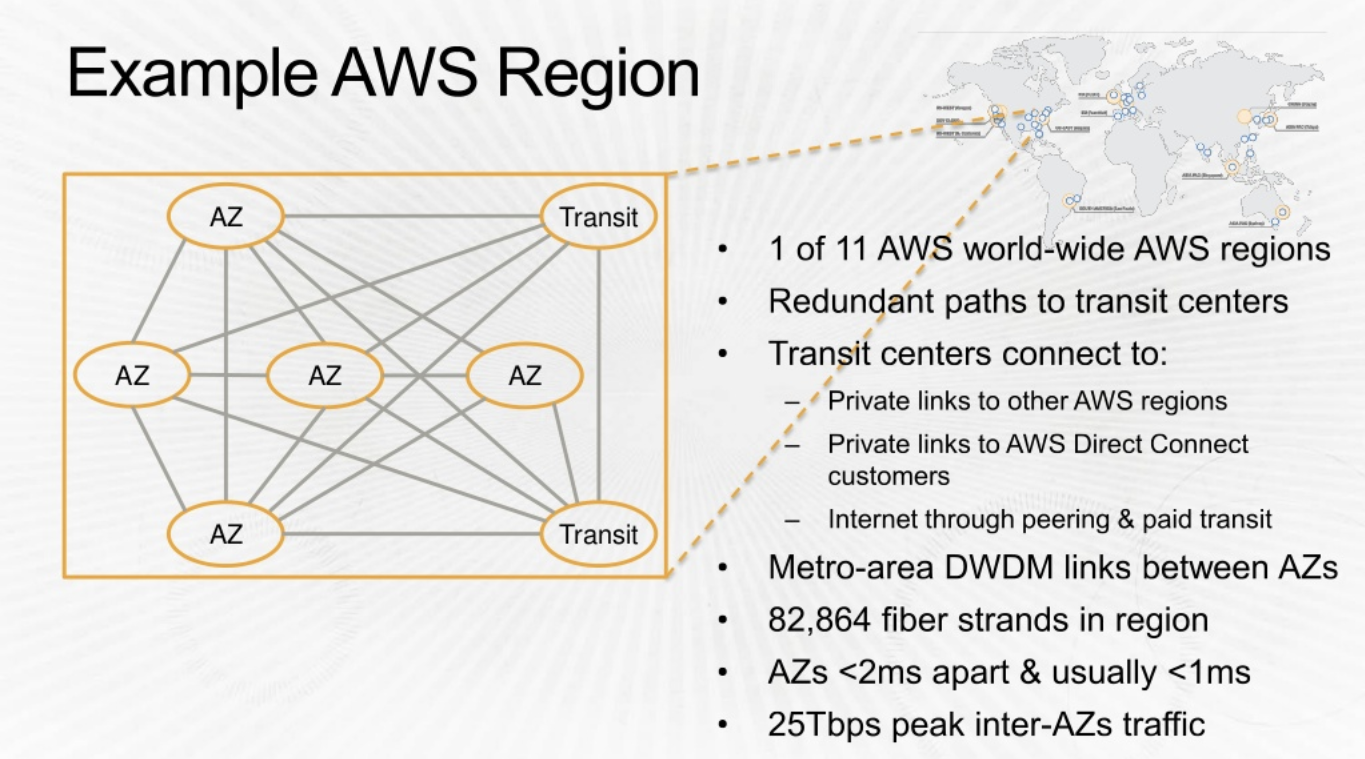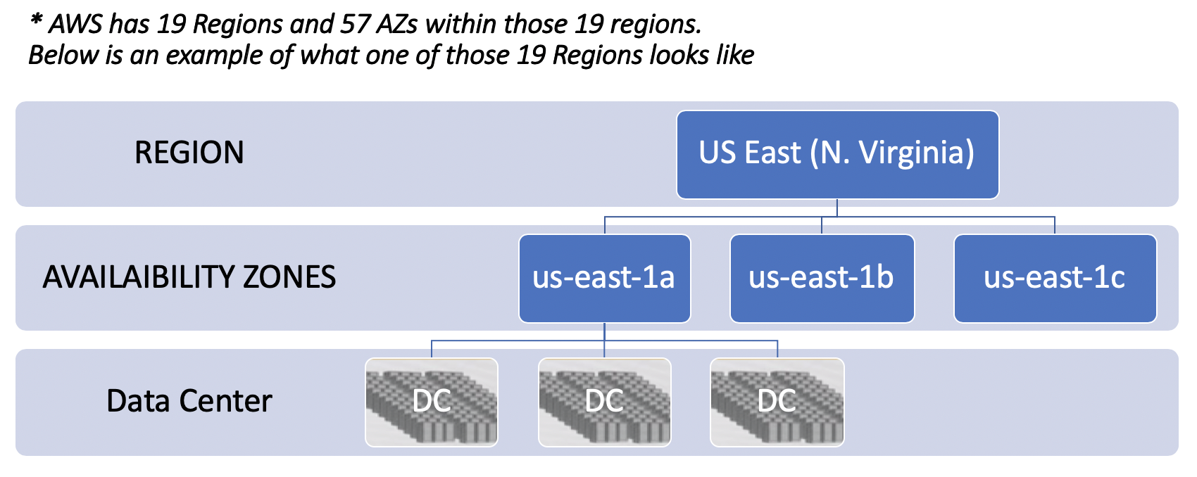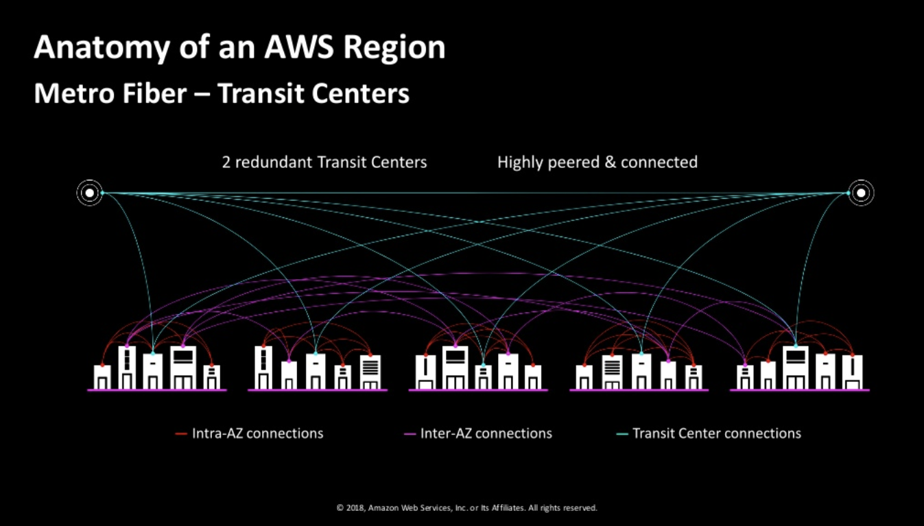 Let look into one of the Regions: US East Each region has at least 2 availaibility zones. Instead of a DC being a region, AWS has an AZ as a Region. There are two transit centers which connect to customers.
