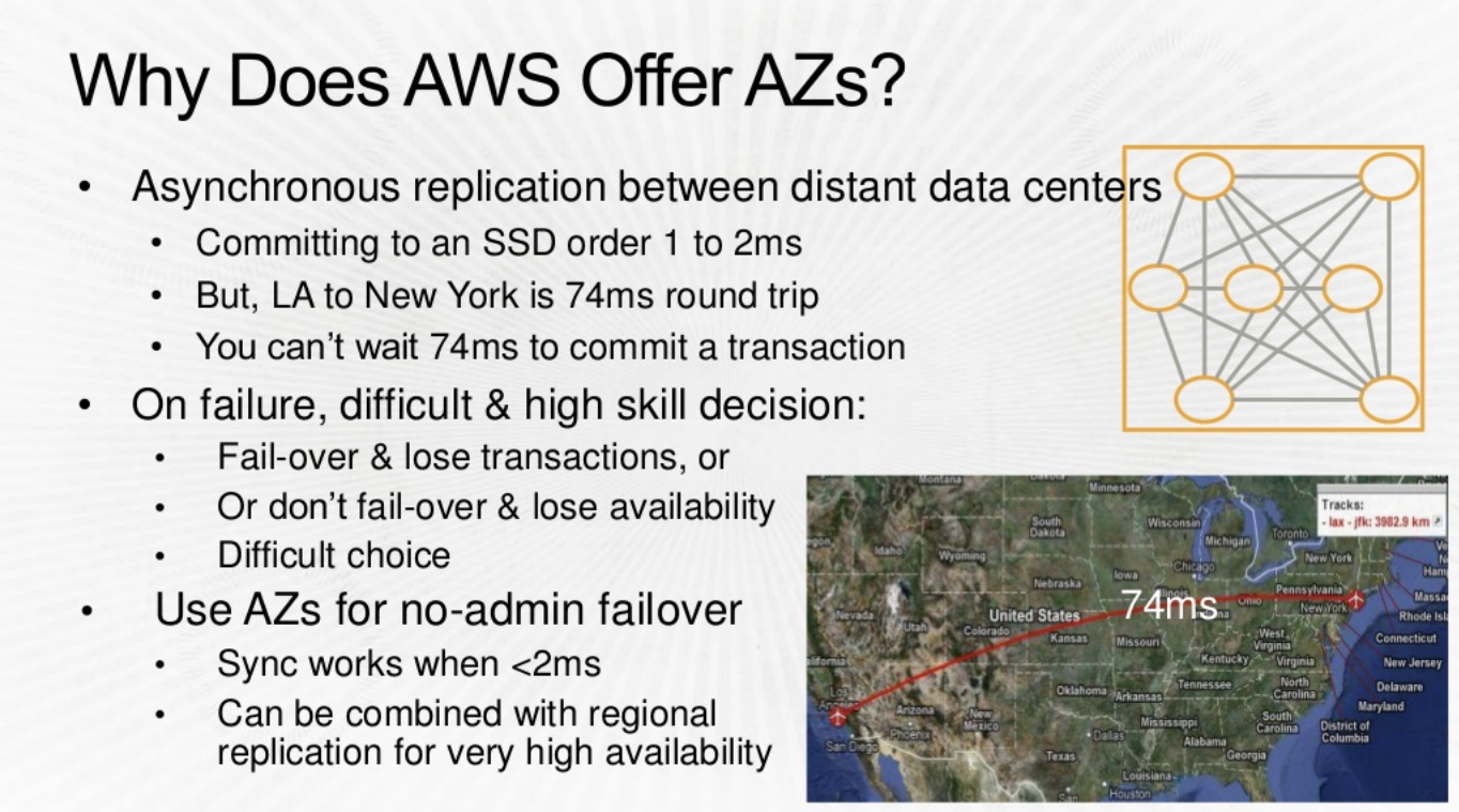 - If an AZ you can commit synchronously to your Data with a 1ms delay rather than 74ms delay (above) . This is empowering and great for the applications.