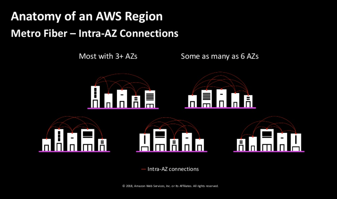 The AZs are quite apart (few miles). The speed between AZs are extremely high. 25Tbps.