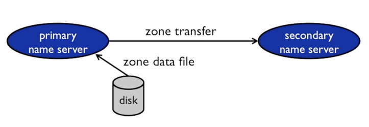 SECONDARYis first setup , it sends an AXFR request to the primary to copy the zone data file. - The PRIMARY sends the zone information to the secondary.
