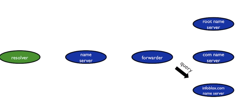 In the example below the Resolver sends the recursive query to the “name server” which forwards the query to the “forwarder” ; which in turn does the recursive name lookup.