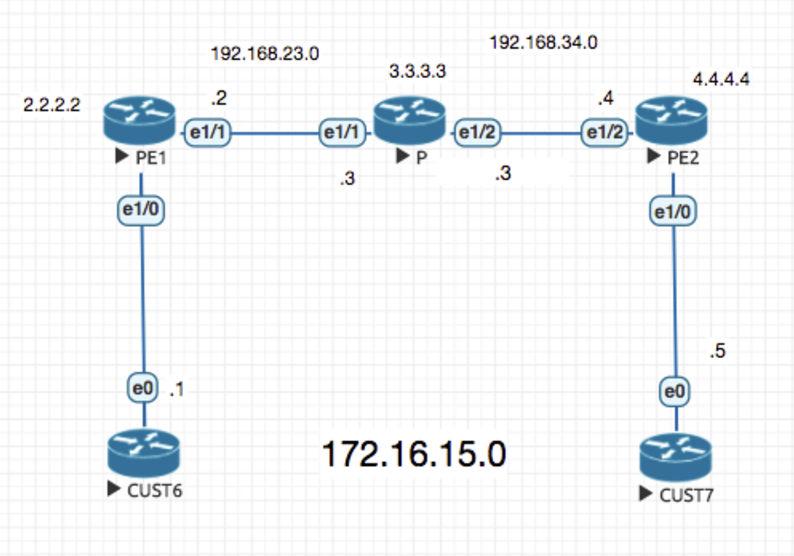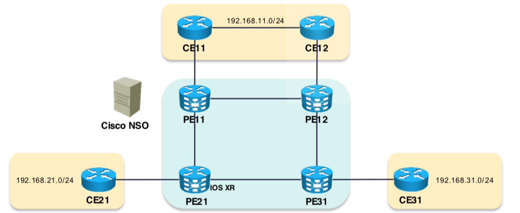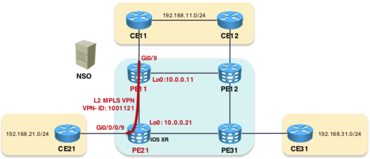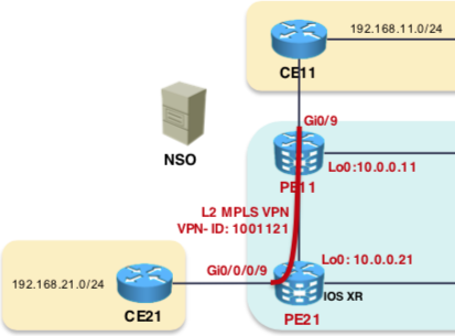 Make a real router lab for the following and deploy multiple peers between PE1 to PE2 on different ports , and making the configuration changes via NSO